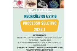 O Programa de Pós-Graduação em Patologia (PPGPatologia) da Faculdade de Medicina (Famed) da Universidade Federal do Ceará (UFC) lança EDITAL Nº 01/2025 para seleção de estudantes para preenchimento de vagas nos programas de Mestrado e Doutorado, para ingresso na turma 2026.1. As inscrições ocorrerão no período de 8 a 21 de outubro de 2025, para o preenchimento de até 14 (quatorze) vagas para o Mestrado e de até 9 (nove) vaga para o Doutorado.