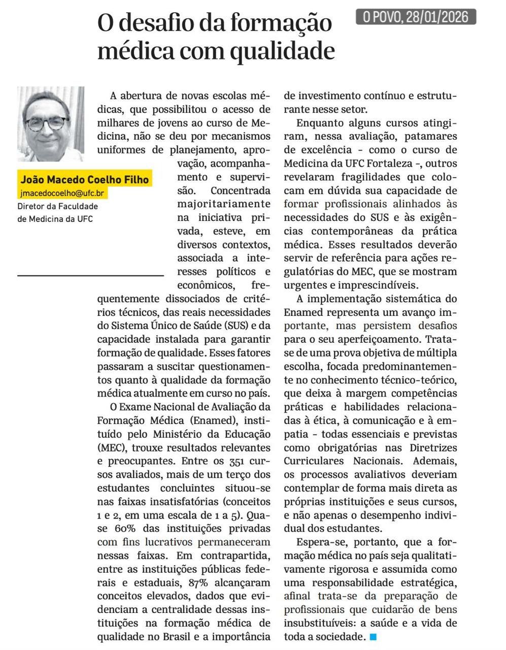 João Macedo Coelho Filho: o desafio da formação médica com qualidade – Jornal O Povo, em 28 de janeiro de 2026